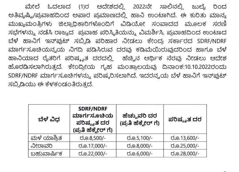 2022ರ ಅಕ್ಟೋಬರ್ 10ರಂದು ಕೇಂದ್ರ ಗೃಹ ಸಚಿವಾಲಯವು ಬೆಳೆಹಾನಿ ಪರಿಹಾರದ ಮೊತ್ತವನ್ನು ಪರಿಷ್ಕರಣೆ ಮಾಡಿತ್ತು.